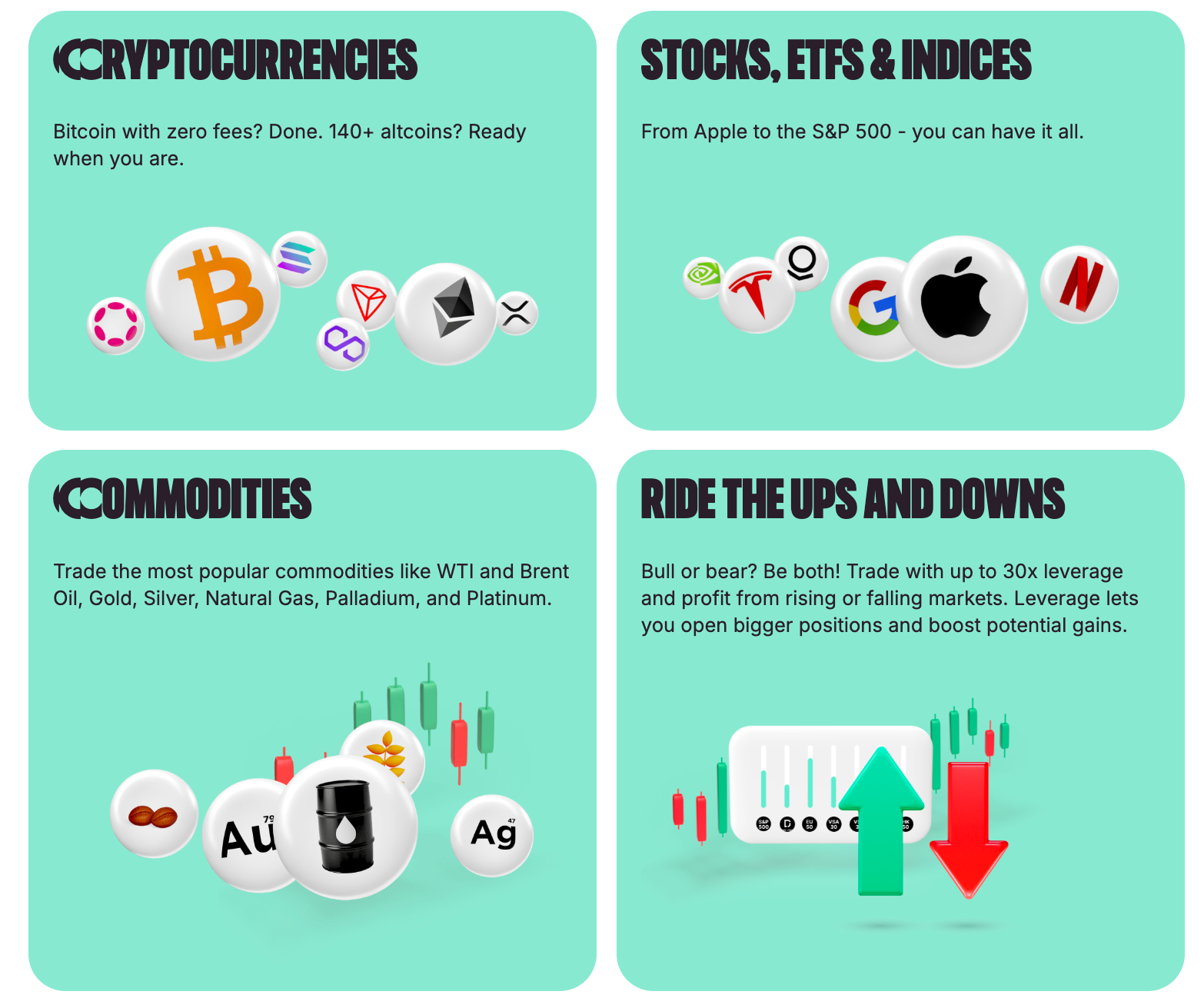 - Product offerings: Change offers 500+ tradable assets in cryptocurrencies, stocks, forex, commodities and leveraged products like trading CFDs. The platform allows trading with as little as €10 and offers up to 30× leverage on major forex pairs and specific CFDs, strictly in line with European regulations.