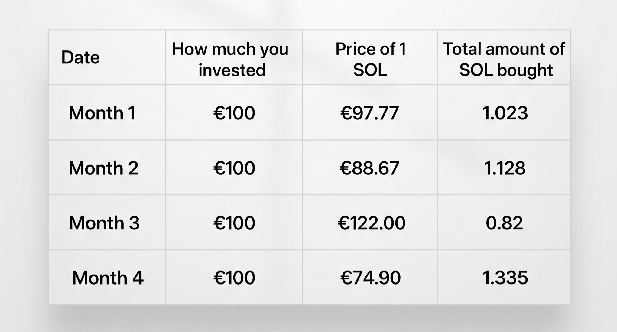 Oletame, et teil on investeerimiseks kokku 400 eurot. Otsustate investeerida Solanasse (SOL) 100 eurot iga kuu alguses. Sõltuvalt turust võib SOL-i hind suuresti erineda, seega on teie 100 euro eest saadav SOL-i kogus iga kord erinev.